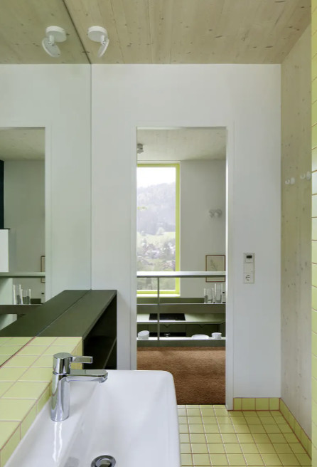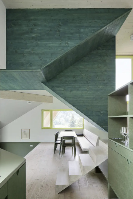 Pagrindinis šio būsto akcentas – ryški ir gaivi žalia spalva apdailos elementuose. Sodriai žali čia – ir JUNG jungikliai iš „Les Couleurs® Le Corbusier®“ serijos. Gyvybingi, „Vert anglais“ žalios akcentai padeda ne tik vizualiai įrėminti kotedžo interjerą, bet tuo pačiu ir sujungti jį į darnią visumą.