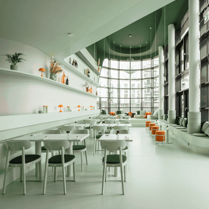 Šis bistro – idealus pavyzdys, kaip subtilios detalės gali ne tik paįvairinti dizainą, bet ir pabrėžti JUNG „Les Couleurs® Le Corbusier®“ paletės galią: net ir tarpusavyje kontrastuojančios spalvos gali atrasti bendrą ritmą.